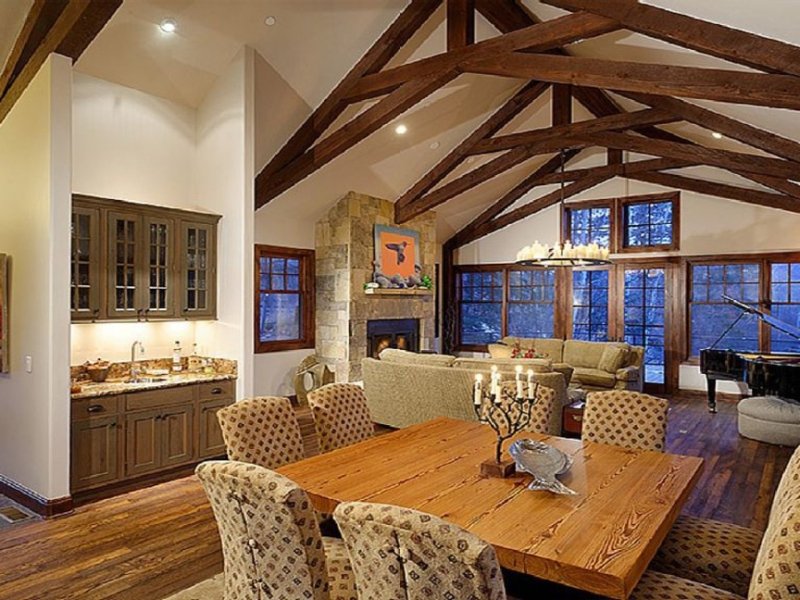 On the lower level is a media/family room, which features a stone fireplace, large sectional couch, 60″ HD Samsung TV, intricate artwork, hardwood floors, and gorgeous views. Beside the living area you’ll find a dining table that seats 8. The designer kitchen is fully stocked and equipped complete with a SubZero fridge, Wolf gas cooktop, microwave, and oven. Adjacent to the kitchen is the upstairs family/TV area and behind the kitchen is a great room and a second dining area, which also has a wet bar (Please note that the Steinway piano pictured in the photo is no longer in the room). Off this room is a large, wrap-around deck with outdoor furniture for summer, overlooking Roaring Fork River.